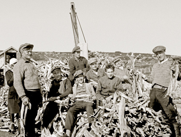 Ei nälkä ahistele Pummankin kylässä. Miesjoukko turskan lajittelussa.