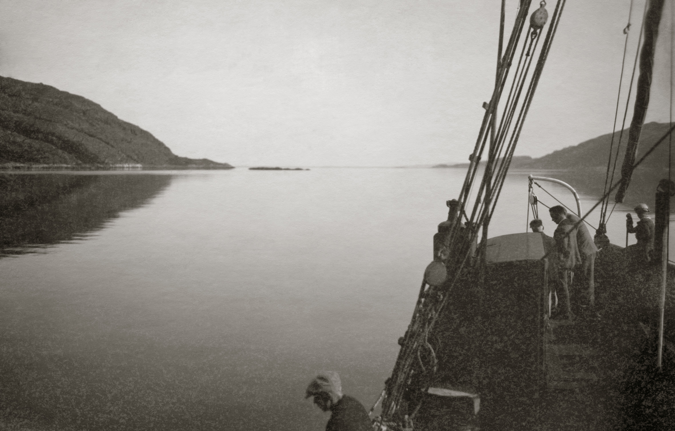 Aava meri Petsamon vuonon suulla Juho Vesaisen kannelta kuvattuna