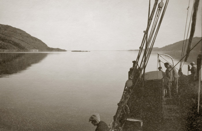 Aava meri Petsamon vuonon suulla Juho Vesaisen kannelta kuvattuna.